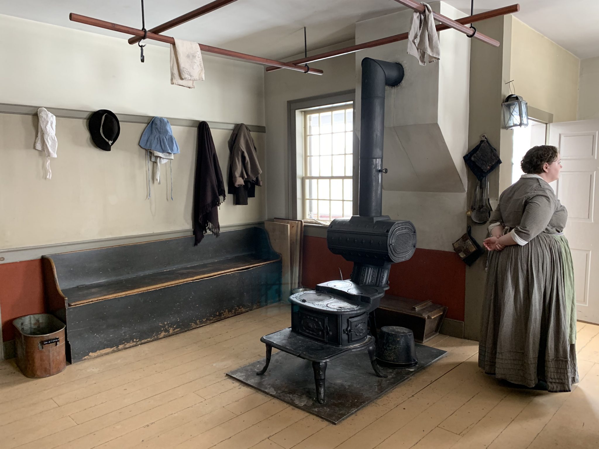 When I visited, Grace had freshly baked “sandheart” cookies waiting on the giant family-sized table while she wove cotton tape for use on period clothing as ties for storage bags and general household uses. Throughout the year, staff tasks include spinning, dyeing, gardening, drying and preserving food, tending the stove fire in the kitchen and hosting guests, all true to the 1850’s time period.