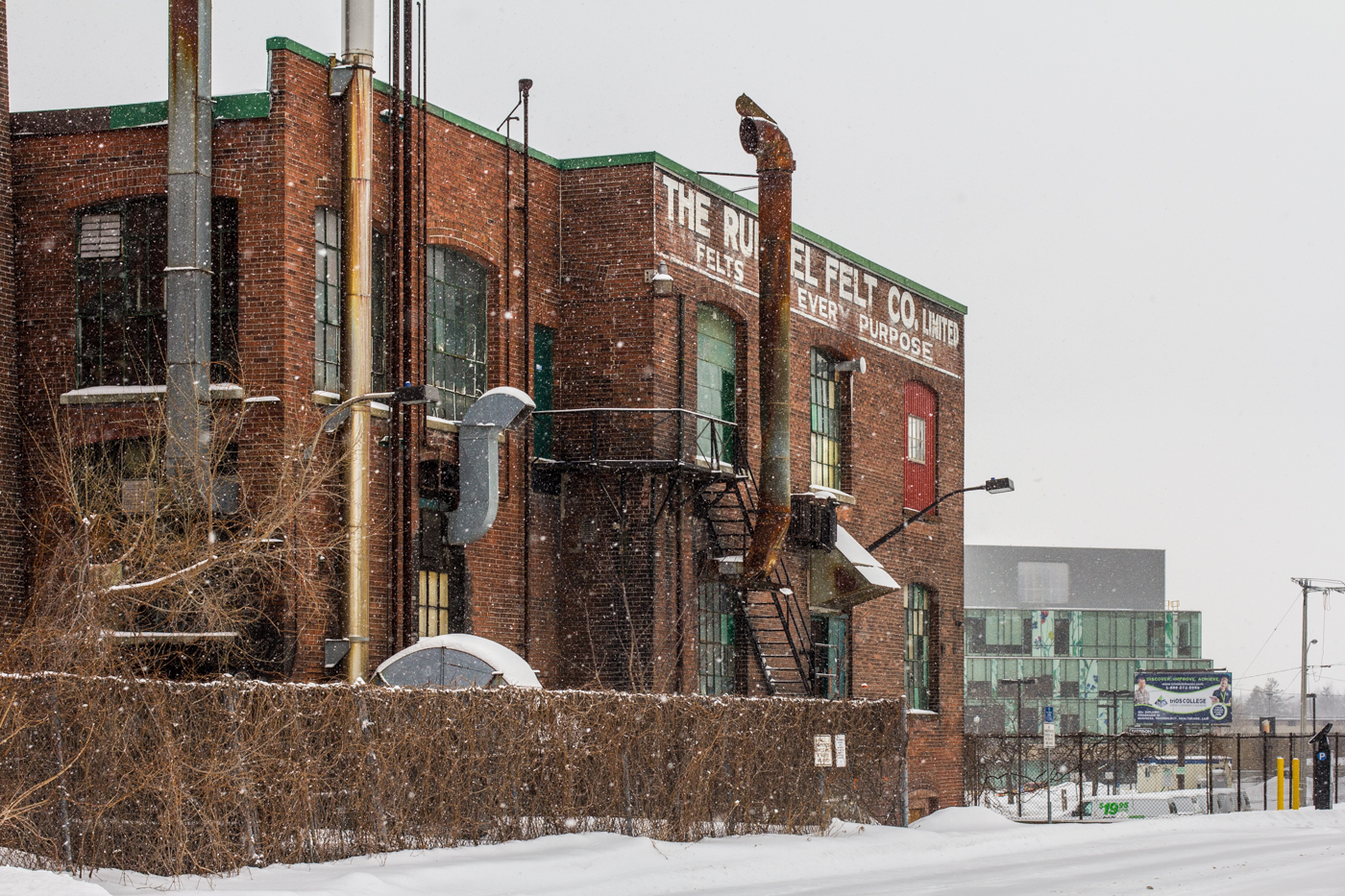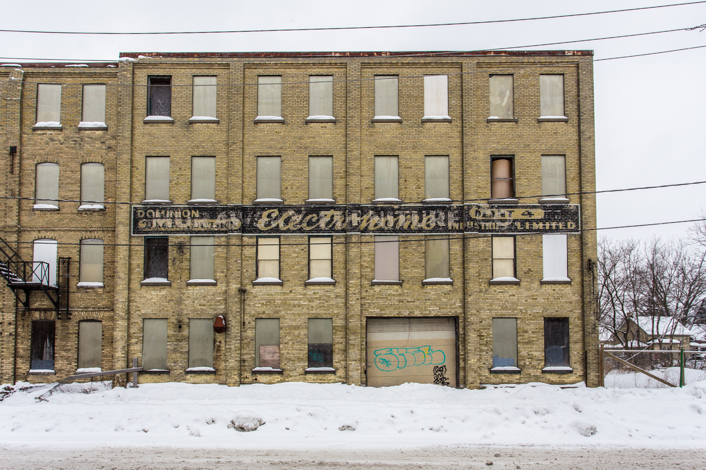 Boarded up windows and doors, a black paint sign slowly conceding to yellowing brick, and paint swatches covering graffiti — the former Electrohome Industries plant physically dominates the corner of Duke and Shanley Streets. First known as Pollock Manufacturing, Electrohome manufactured phonographs and cabinets and by the mid 20th century, the brand was commonplace in Canadian households — manufacturing radios, furniture, and colour televisions. Despite persistent rumours of condominium development, the future of the former plant, one of twelve in Waterloo Region, is unclear. In 2011, the City of Kitchener attempted to sell the building, in order to collect on unpaid property taxes, and more recently notable deterioration of the brick façade has been observed. Unlike many old manufacturing buildings in Kitchener, redevelopment won’t be easy — the site is contaminated with tricholoroethylene, an industrial solvent. What is clear is that any redevelopment will require a financially committed and enthusiastic investment.